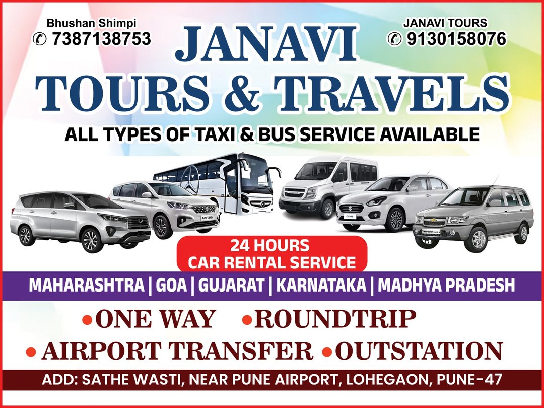 JANAVI TOURS AND TRAVELS is a trusted cab service in Pune located in Lohegaon, providing reliable taxi service in Pune for local and outstation travel. We specialize in Pune Airport cab service, Pune to Mumbai cab service, Pune to Shirdi taxi service, Pune to Mahabaleshwar cab service, Pune to Nashik cab service and Pune to Goa cab service at affordable rates. Whether you need local cab service in Pune, intercity cab service, or one way taxi from Pune, we ensure professional drivers, clean vehicles and 24/7 customer support. Book the best tours and travels in Pune for safe, comfortable and on-time travel.